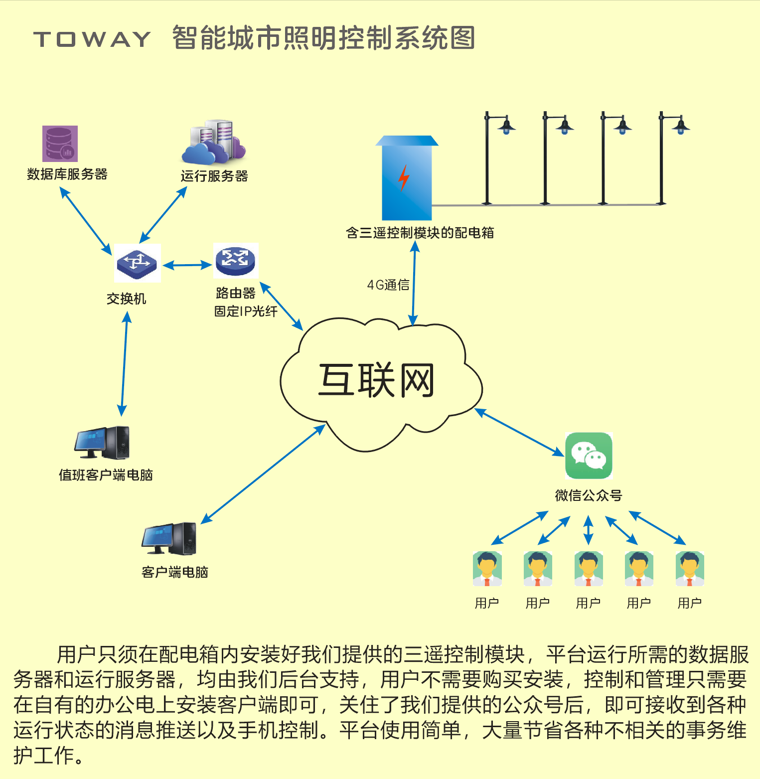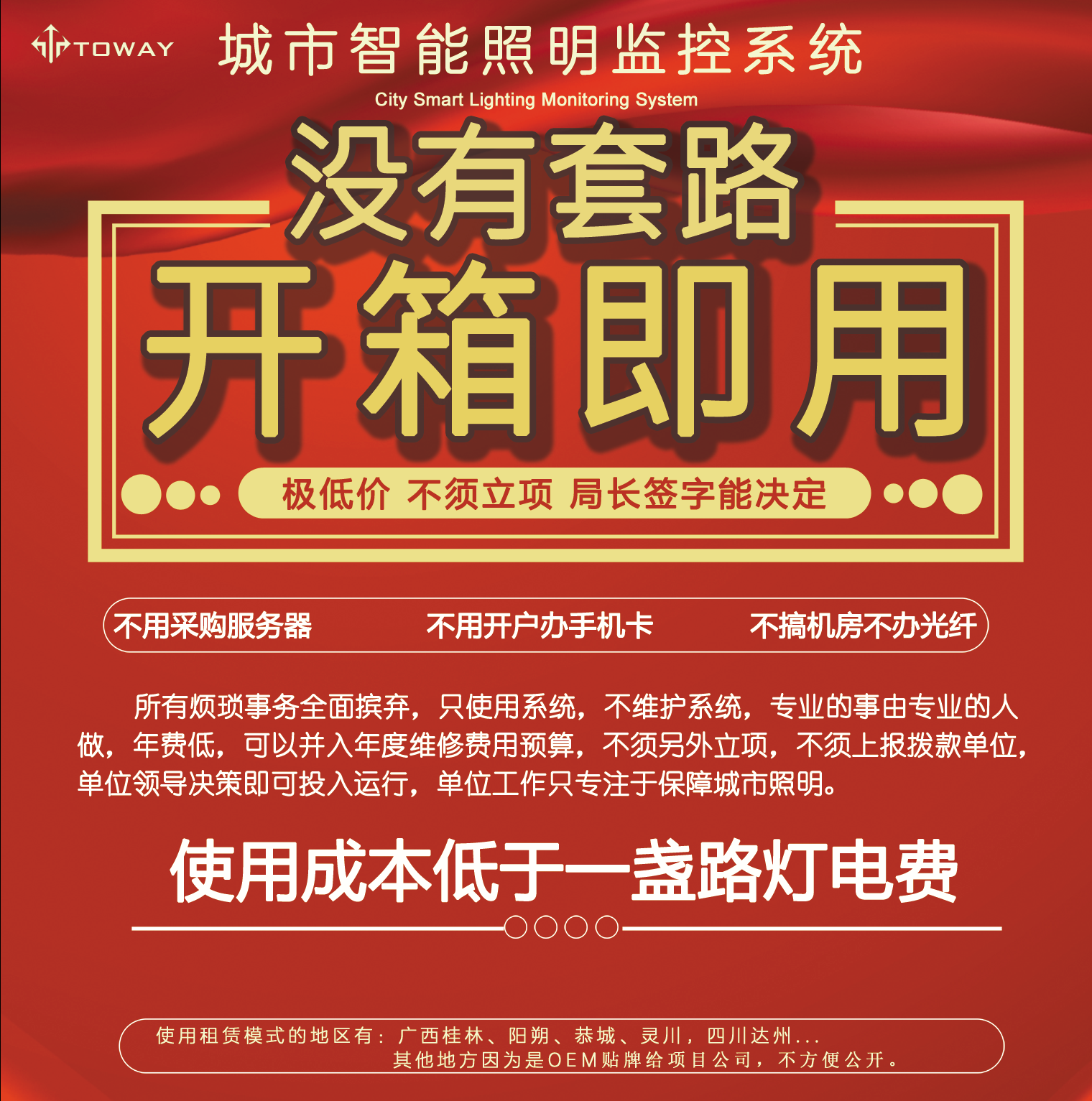 此方案對于一個縣城100臺路燈配電箱的體量,首年開支也只有三萬五千元,此后每年費用是兩萬五,本方案最大的優(yōu)點就是費用低廉,這筆費用完全可以并入年度維護(hù)撥款中核銷。且不會有設(shè)備過保要重新采購的問題出現(xiàn)。
